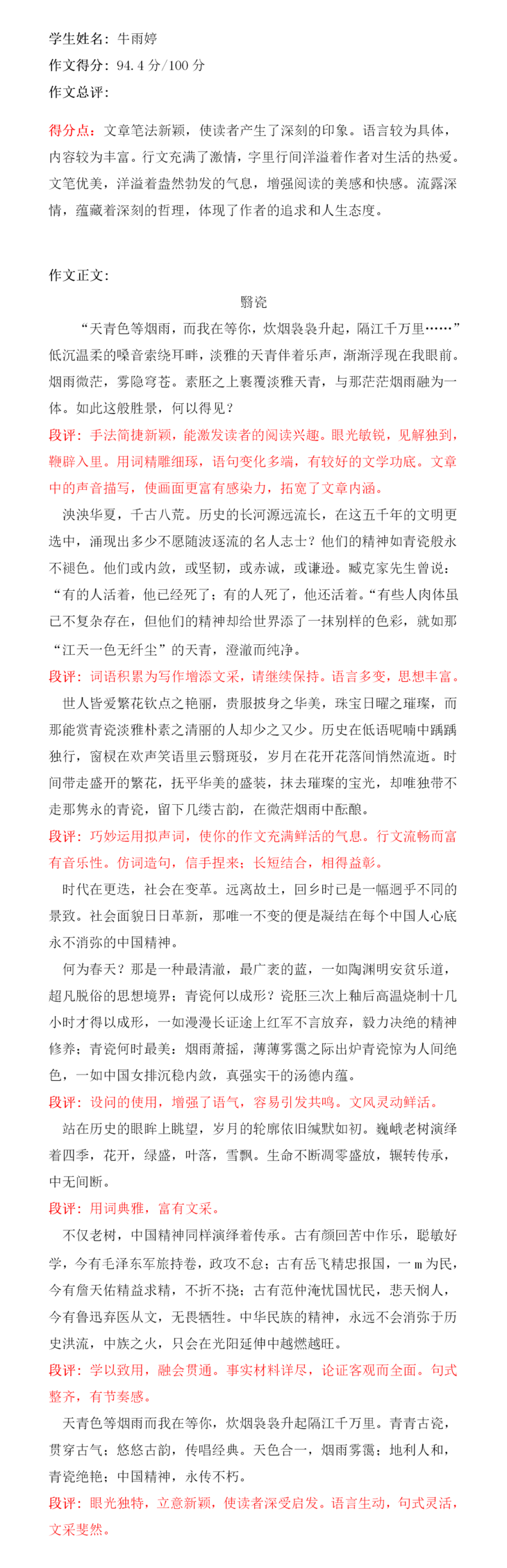 华夏,从历史中走来,在时间洪流中更迭,在朝代更替中发展。泱泱大国,铸就了一代又一代优秀的中华儿女,或为国征战,或为民写文,亦或为和平捐躯。在拿到题目那一刹那,我便由青瓷联想到了中国精神。青瓷与繁花,衣物,珠宝有所不同,青瓷历经时光洗礼而不褪色的特性,便如中国精神一般,代代传承。如今国泰民安,飞机过天安门再不用飞两遍,但建设中国辉煌,还需青春少年。而支撑少年的支柱,便是永传不朽的中国精神。以民族精神为引,串起这五千年的文明。这盛世,由先人缔造,由少年传承。