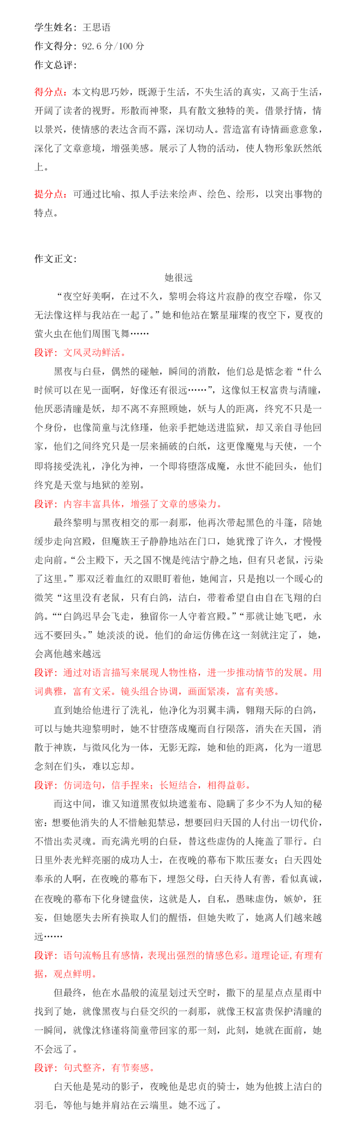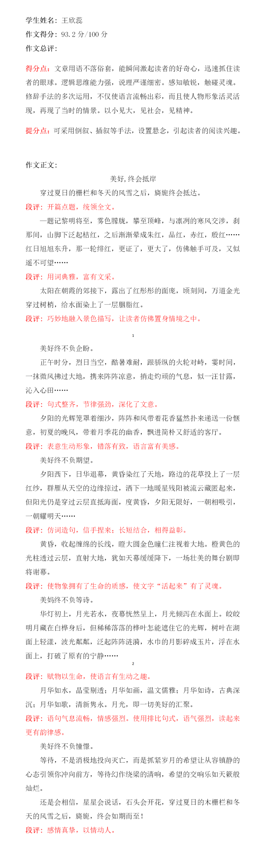王欣蕊这个女孩子特别细心,她善于观察生活中的每一件小事,每次写作都能带给我惊喜,她擅长写景,描写细致是她最大的写作风格,希望她能继续努力,再创佳绩!