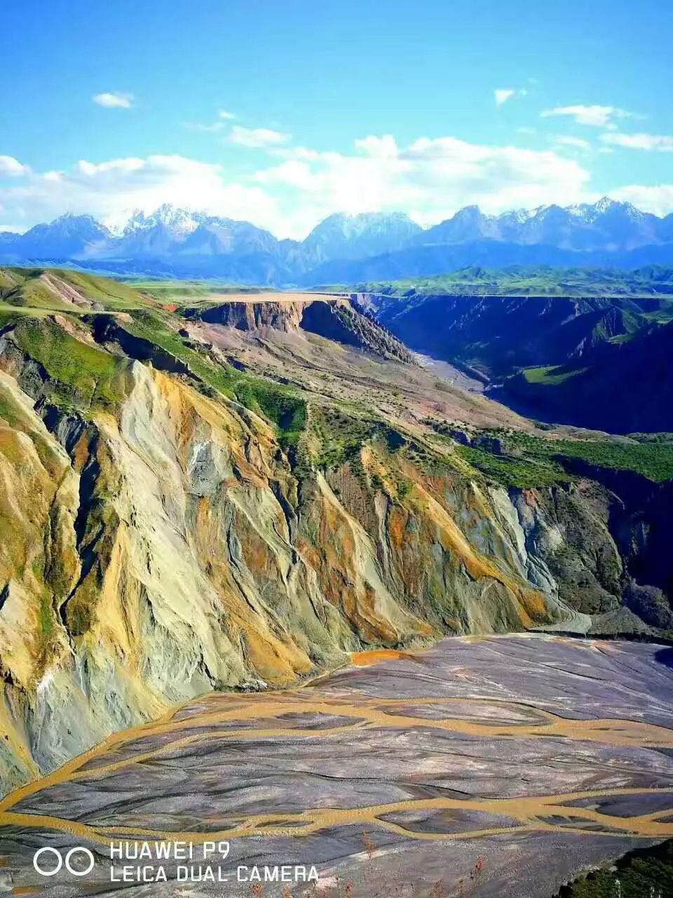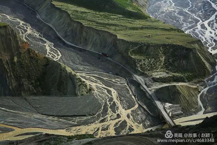 天路像一条绸带飘扬在山崖和谷底,河流配合着飘带蜿蜒着,时合时分,就像生活一样有时阳光灿烂,有时阴云密布。