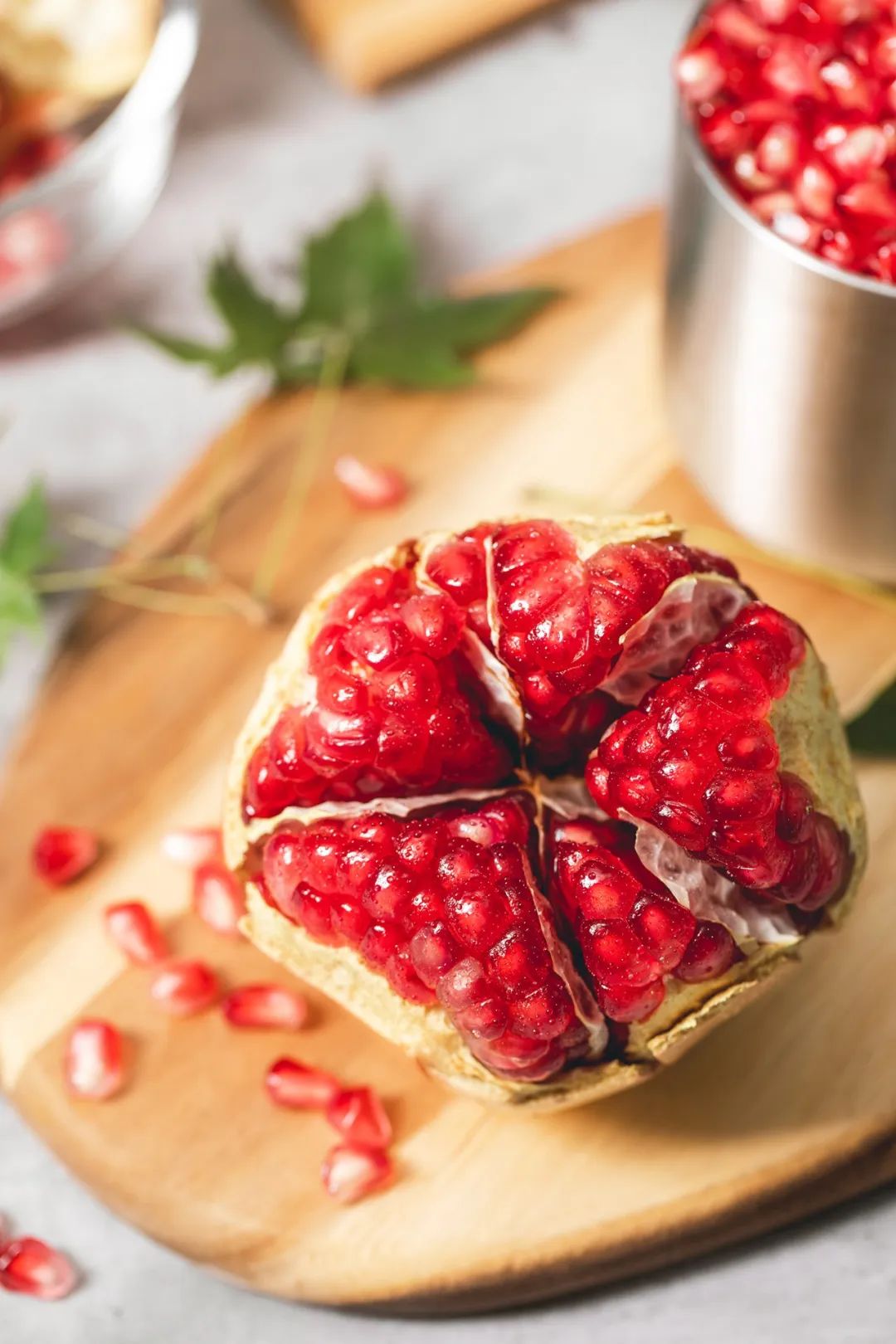 ;果皮被阳光晒得红润诱人;用手轻轻掰开,像是挖开了一座红宝石矿藏,丰富的花青素造就了每一粒石榴子都像红宝石般晶莹剔透,粒粒饱满;