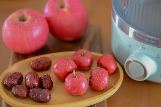 4. 山楂去柄去蒂,和红枣苹果块一起放入锅中。