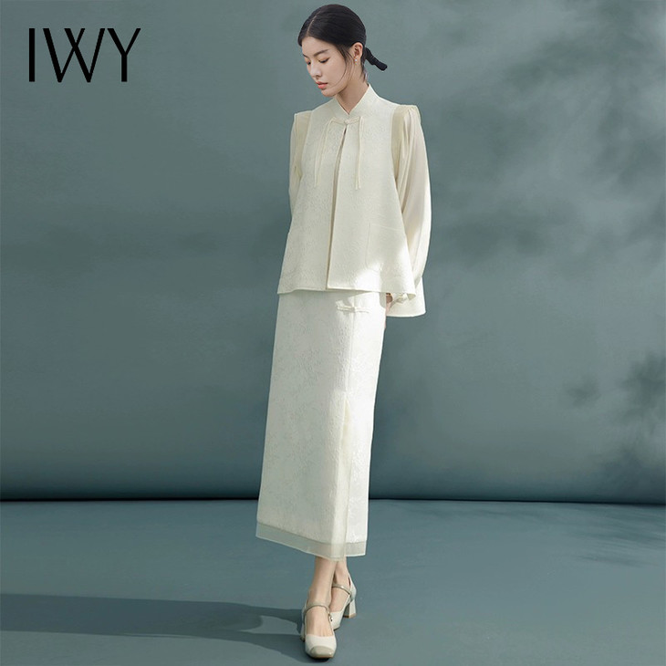 米白色唐装改良版 搭配开叉长裙