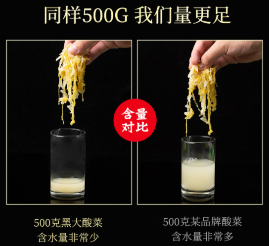 市面上有些酸菜产品,为了保持新鲜度,要留存一定的水份。因此,有些商家就利用这点大做文章,增加了水分比例,占据一定重量。