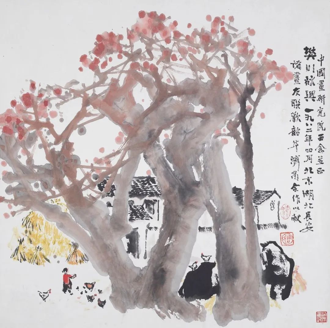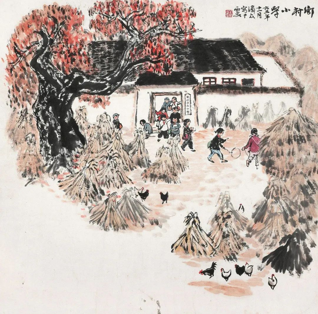这是“长安画派”大师方济众的画,画的是乡村小学放学的一瞬间,画家以极大的热情画小人、草垛、老树、学校,细细品尝,能感到画家的激情跃出纸面。