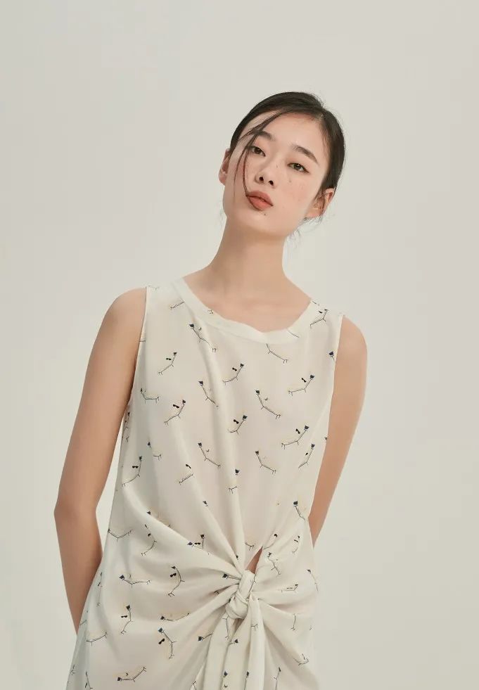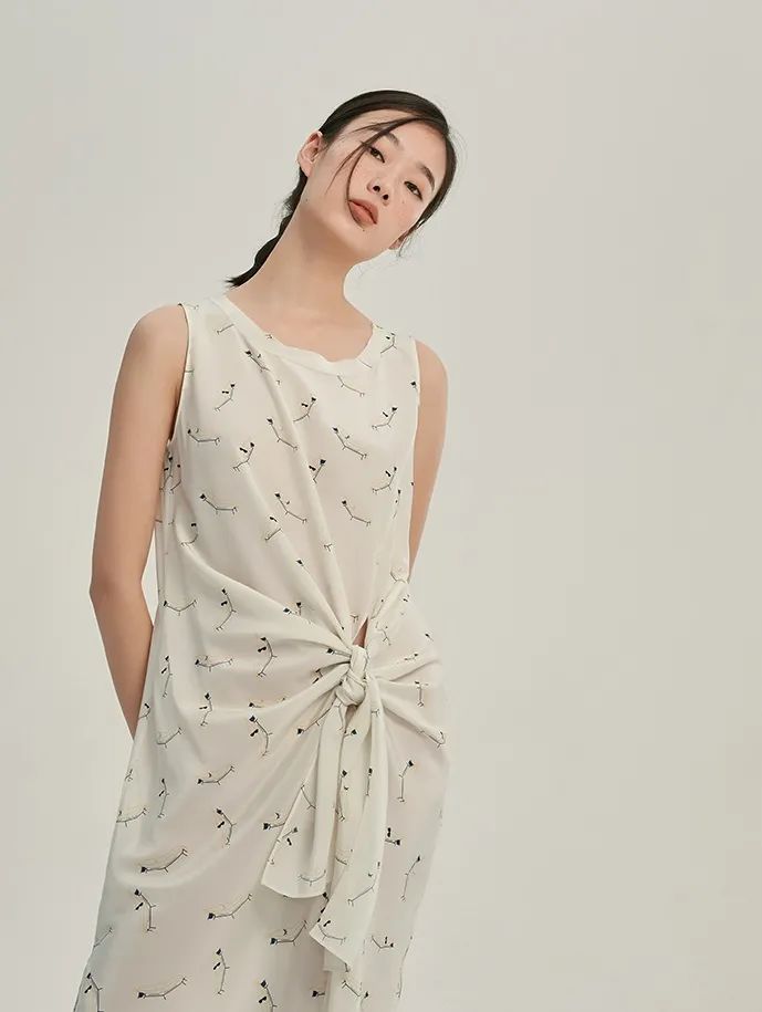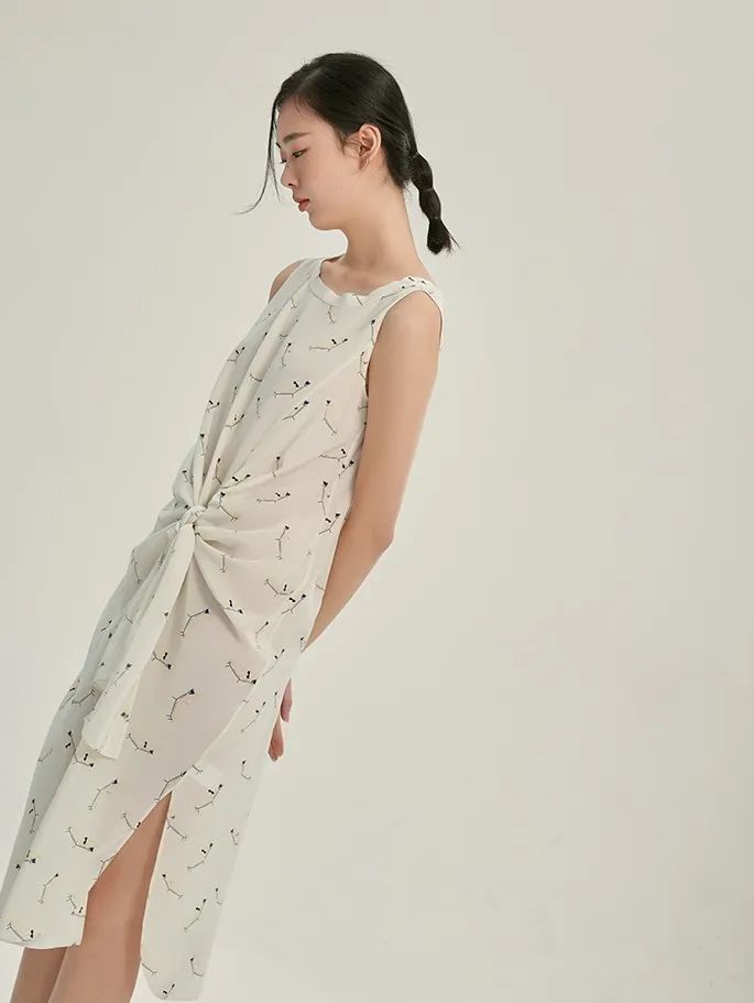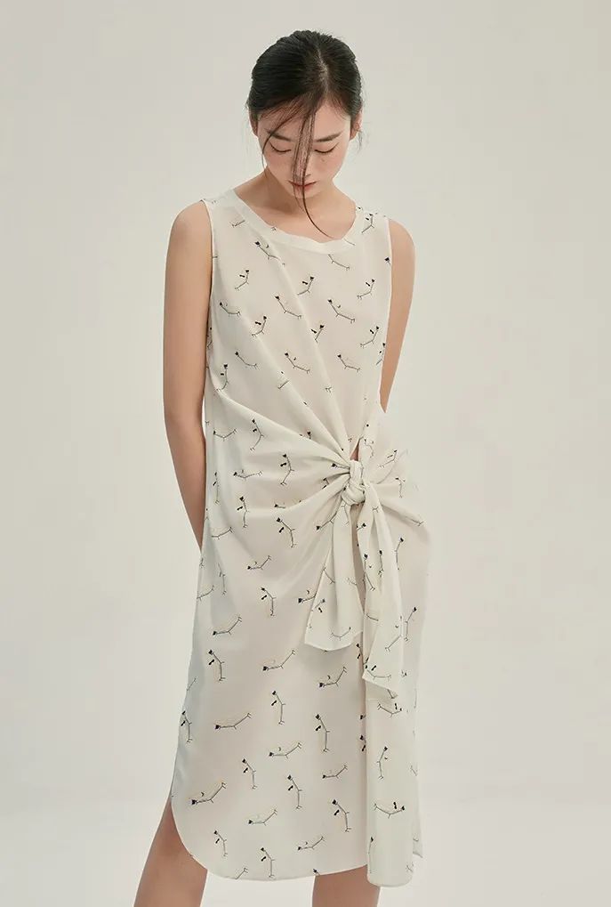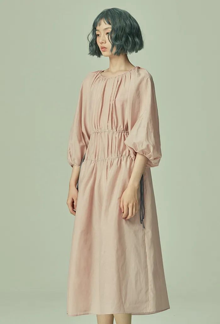 大圆领设计,让美丽的锁骨更为凸显。领口的小毛边设计,为整体带来了细腻的层次感。腰部采用“拧一下”的系带设计,用更有趣的方式,修饰小蛮腰。