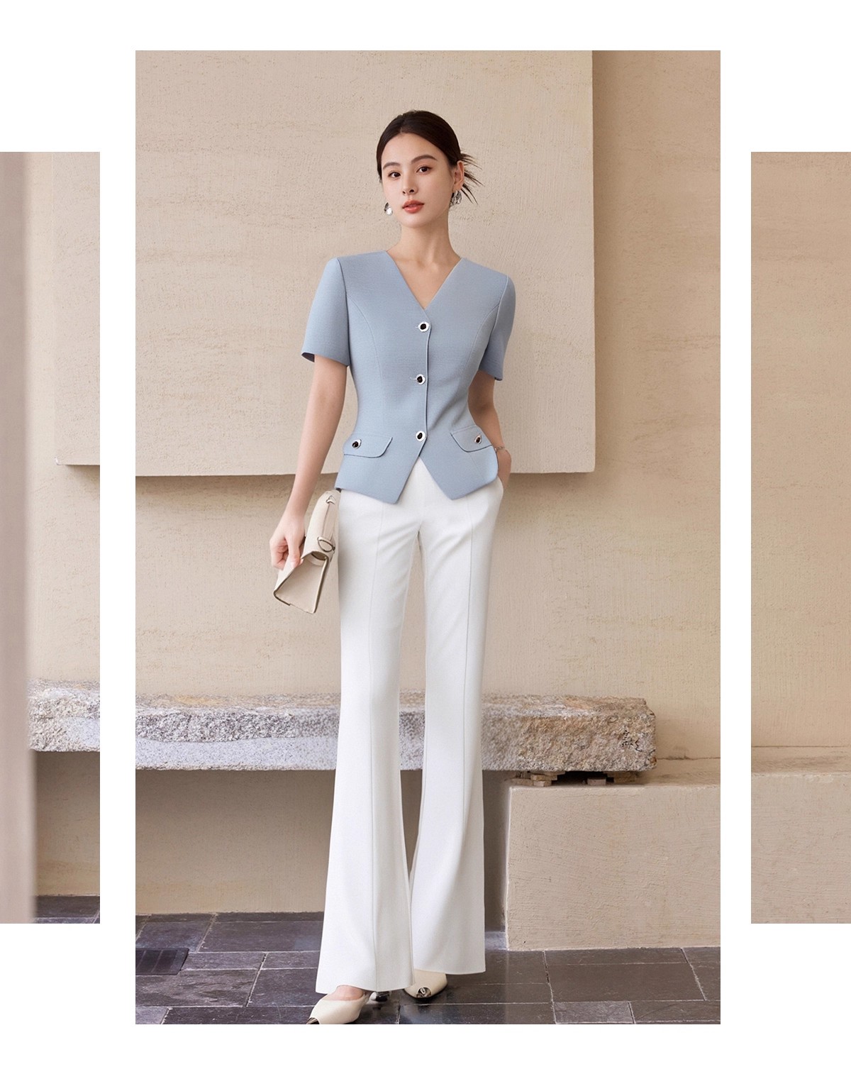 蓝色短袖开衫,简约 V 领弱化正式感,