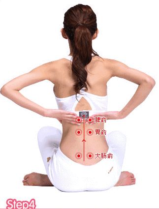光是前面的按摩还不一定好用,最好加上命门到腰俞之间加上这段的膀胱经的按摩,既疏通了腹部的经络和被动地肠道蠕动,也疏通了腰骶部的经络,促使肠道蠕动增强,同时双脚可以交叉按摩足阳明胃经。