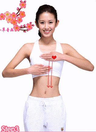 双手从心脏处开始,交换往下按摩,一直到腰部。