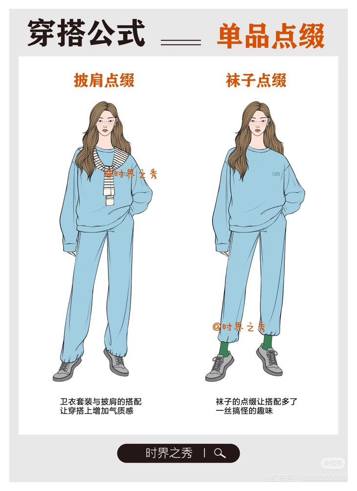 4、 如果是卫衣套装,那就可以搭配一些单品,比如搭配披肩或者是不同色的袜子来点缀。