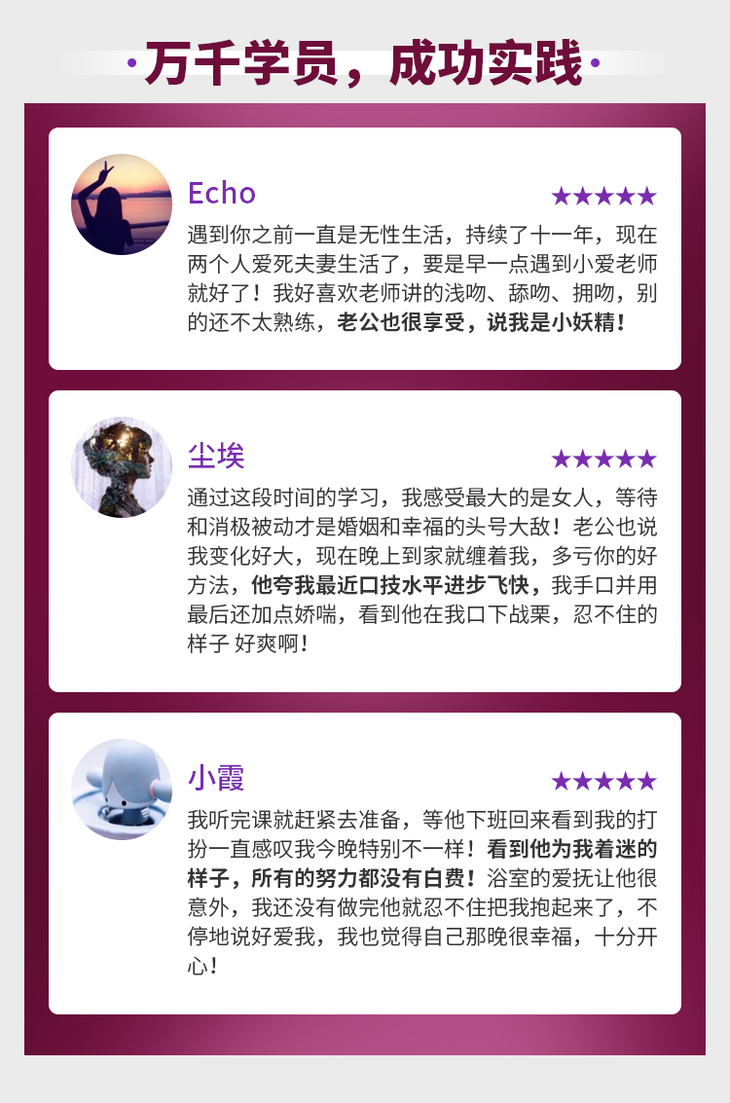 想当初,莉姐也曾一度和老公处在离婚的边缘,那是一段她永远也不愿回想的往事。那时,因为二胎的到来,加上工作上的各种烦心事,生活一地鸡毛。莉姐所有的心思全放在了孩子和家庭琐事上,与老公的亲密生活成了被删减和忽略的部分。心力交瘁的她,有一天她无意间刷到了荷小爱和阿苏的课程。抱着试试看的心态,莉姐听了几节课,很快意识到自己婚姻真正的问题,归根结底是性生活不和谐的恶性循环。在课程指导下,莉姐脱胎换骨。而曾经绝望的老公惊喜地发现,老婆竟然变成了一个在床上充满魅力的“小妖精”。现在的莉姐,总是不时告诫单位那些已婚女士,一定不要忽略夫妻生活对一个家庭的重要性。结了婚的女人,更要懂得如何让自己获得愉悦感,从而给伴侣带来满足感:
