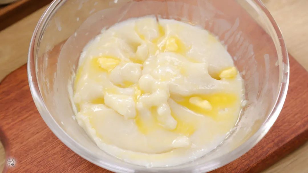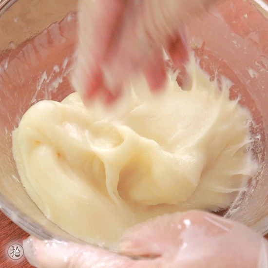 4.戴上一次性手套,加入黄油,揉搓至黄油吸收,反复拉扯增加弹性。