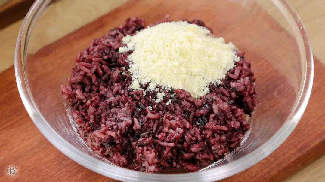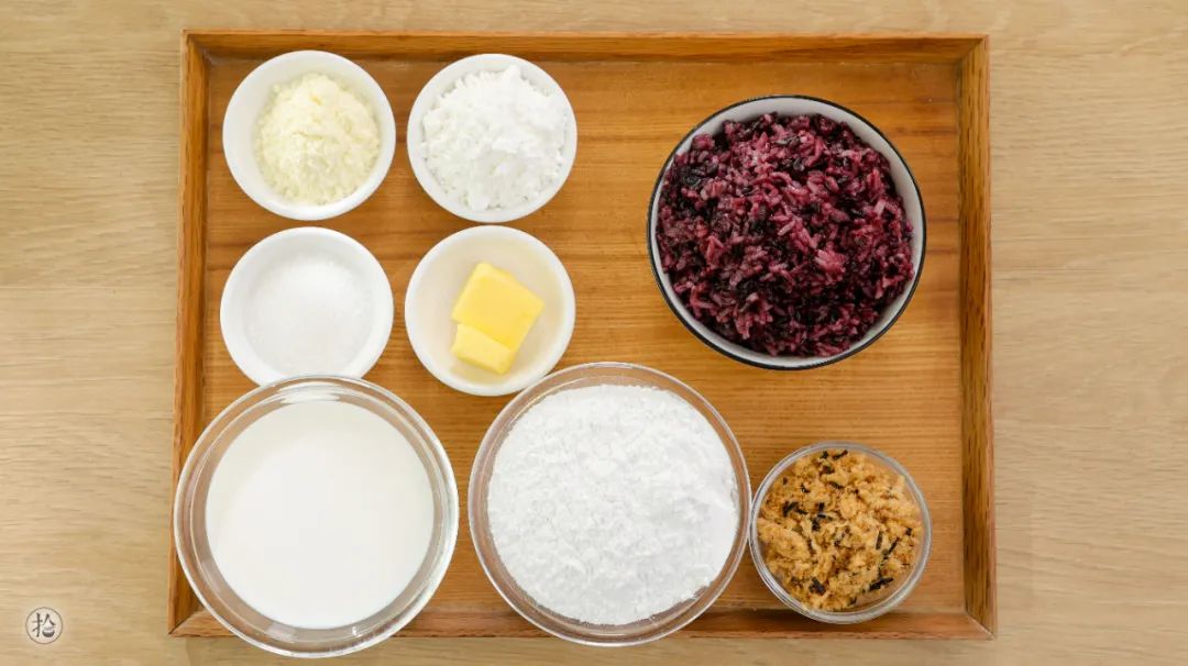 紫米饭/1碗、奶粉/10g、糯米粉/100g、牛奶/150g、玉米淀粉/20g、细砂糖/15g、淡味黄油/15g、海苔肉松/适量