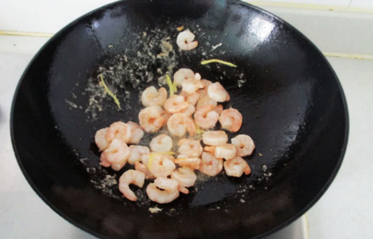 1、热锅凉油,油热后倒入虾仁,煸炒至变色;