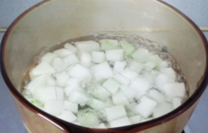 3、锅内水开后倒入冬瓜烧制变色捞起;