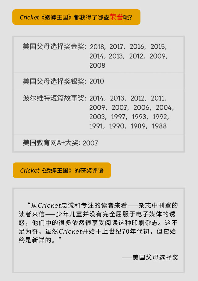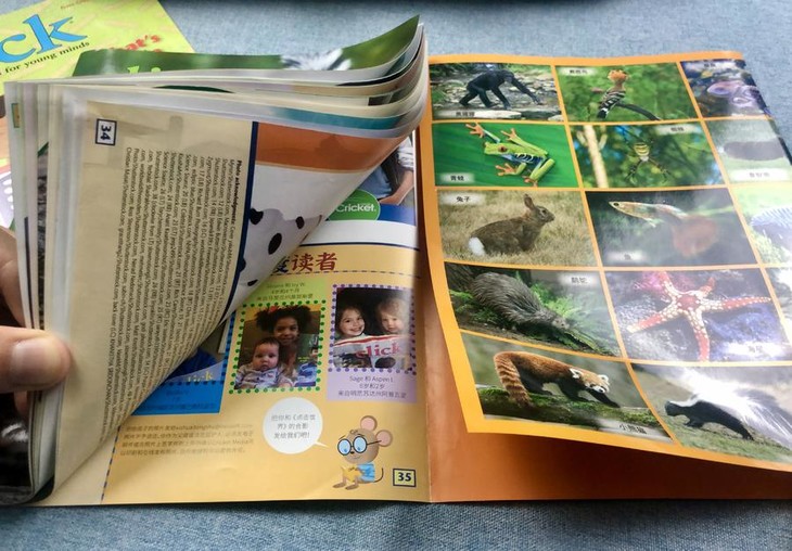 在美国,几乎所有的图书馆和中小学校都订阅收藏Cricket Media的全套刊物。作为课堂内外的补充读物,蟋蟀童书陪伴几代美国人度过童年。蟋蟀杂志的许多词汇和用法都非常地道,有很多词在中国课本上不容易学到,而且英文表达场景化、生活化。