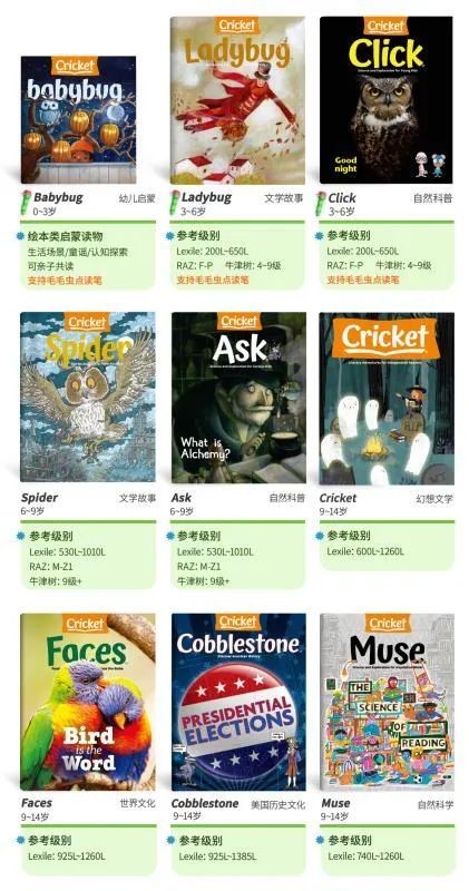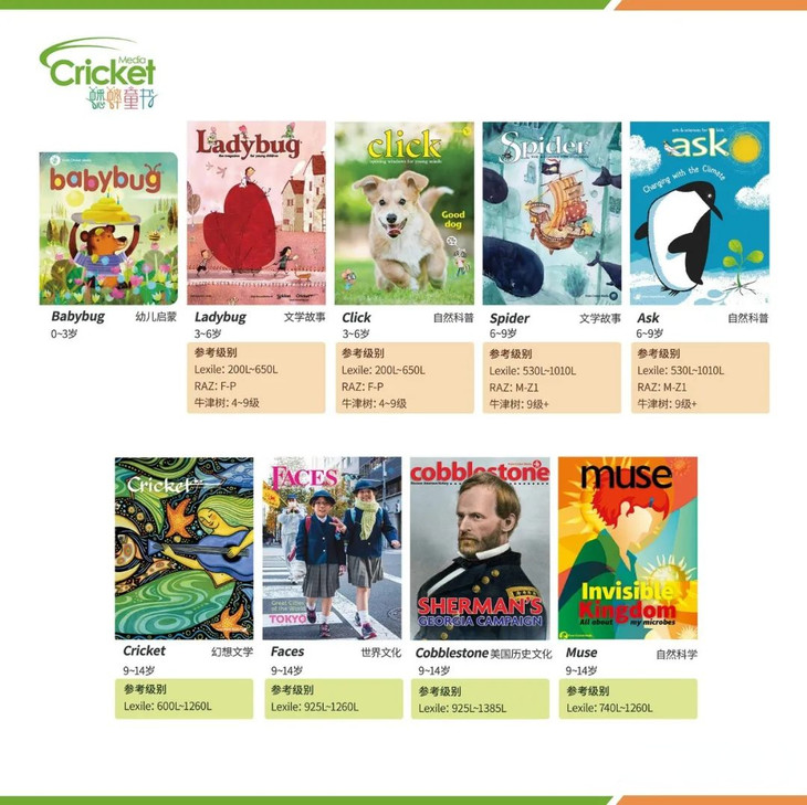 目前在中国销售的蟋蟀旗下杂志共有9种(统称"蟋蟀童书"),可以覆盖0-14岁+的少年儿童。Cricket Media真的是一家良心媒体,集结了一群怀着共同理想和理念,又保持童心的出版人、编辑、指导专家。他们中有人已经跟随杂志长达14年的时间。