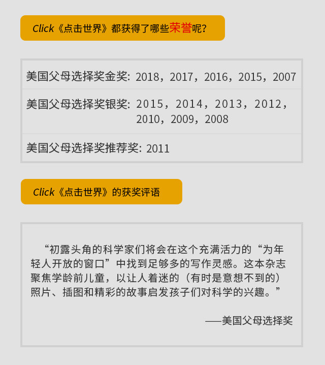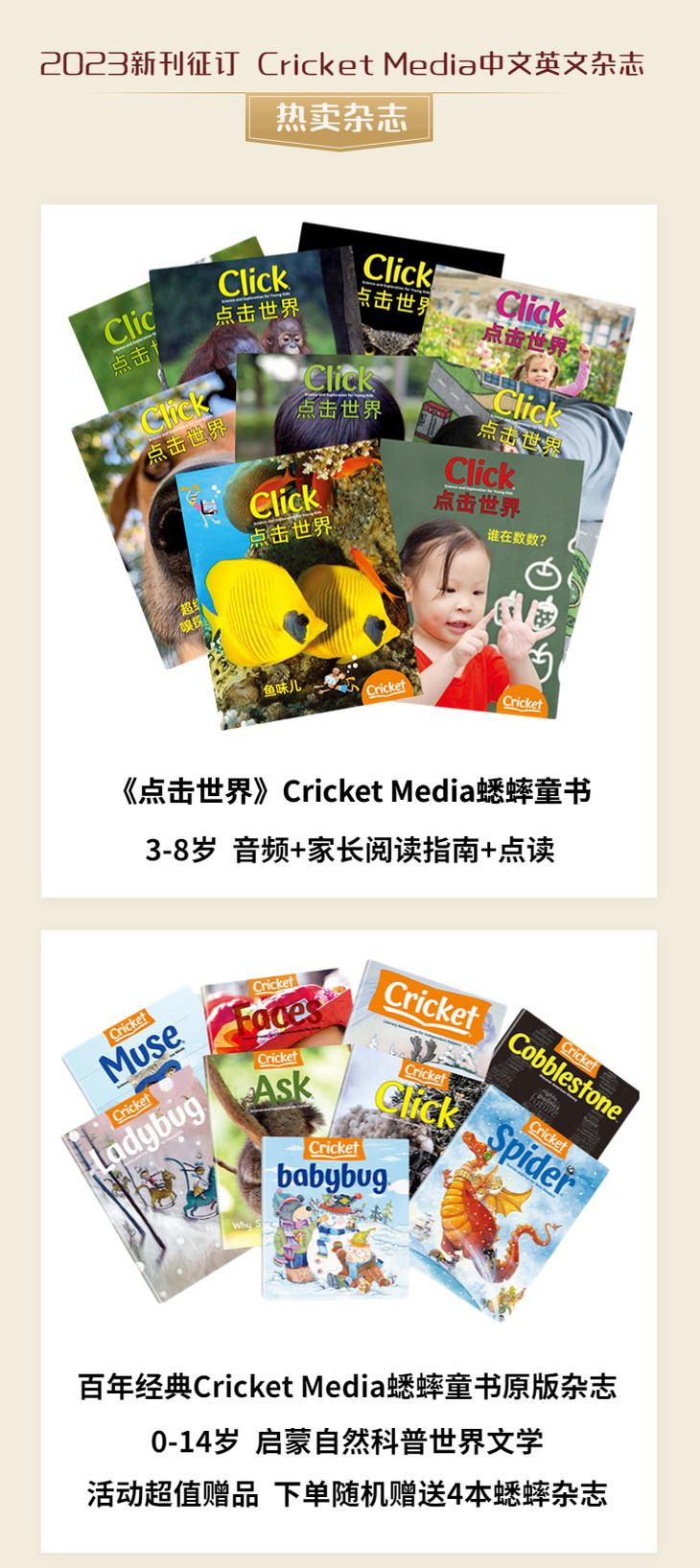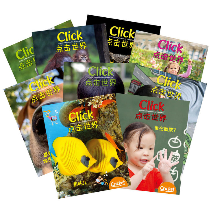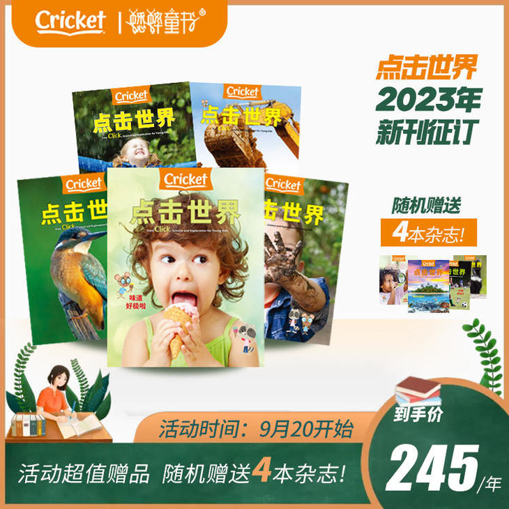 Click 点击世界,中文杂志,适读年龄:3-8岁,全年9期,一句话介绍的话,《点击世界》就是“Click”的汉化版,从封面到排版到内容,完全一样,而且,《点击世界》其实也是,Cricket Media时隔二十年后创立的一本新杂志。对于品质的把控,是与原版杂志一视同仁的。大家可以放心!