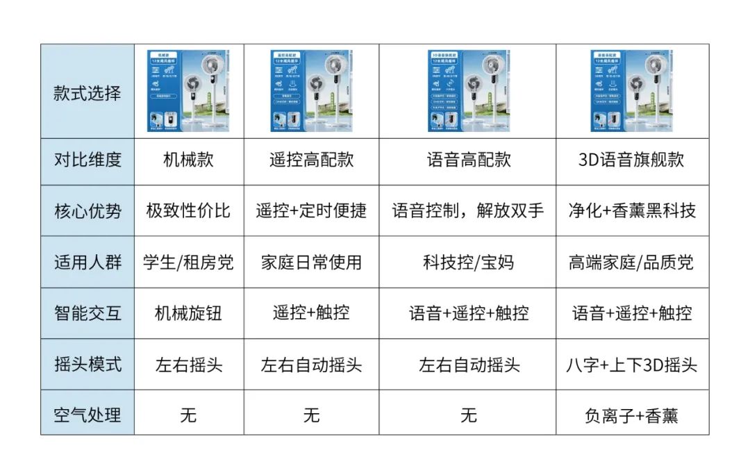 咱们这款空气循环扇,一共有4个款式:机械款、遥控高配款、语音高配款、3D语音旗舰款