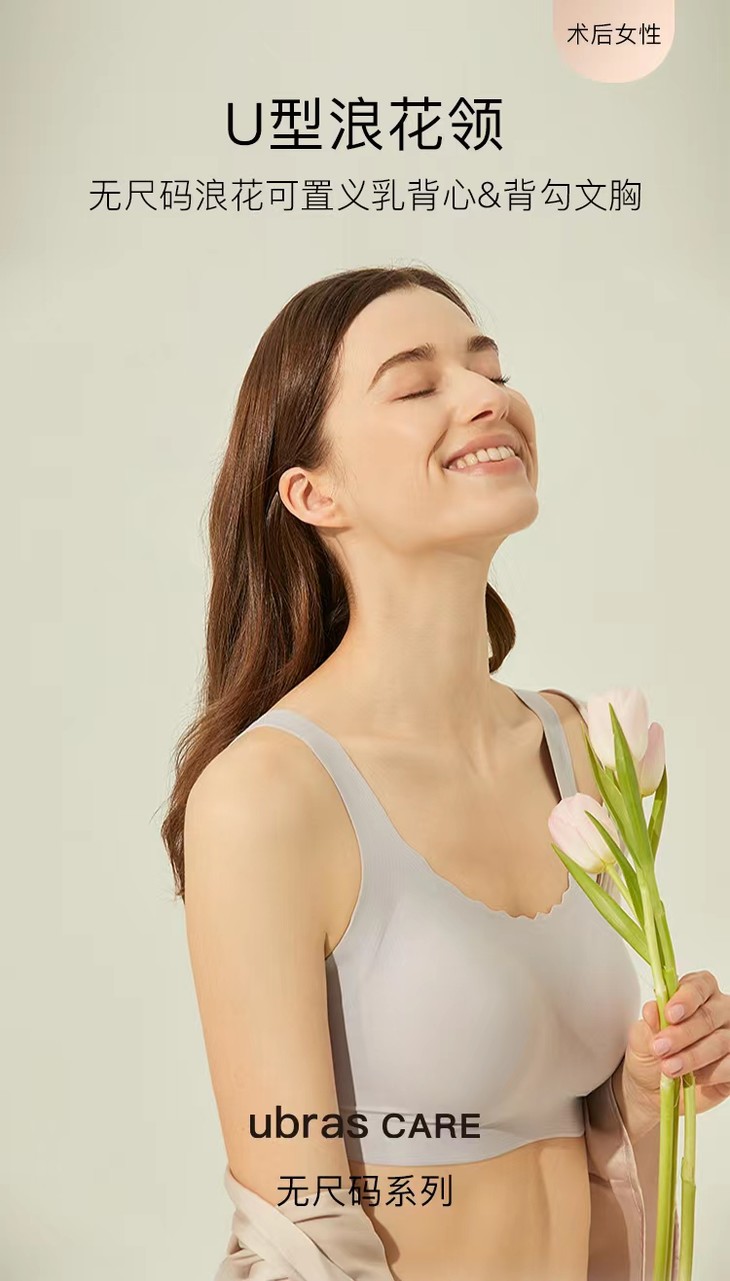 ubras care沿用ubras原创无尺码工艺及其它多项专利技术,并结合乳腺预后患者敏感肌肤的特定需求,专门研发与设计了适合术后女性穿着的呵护(Ucare)系列。