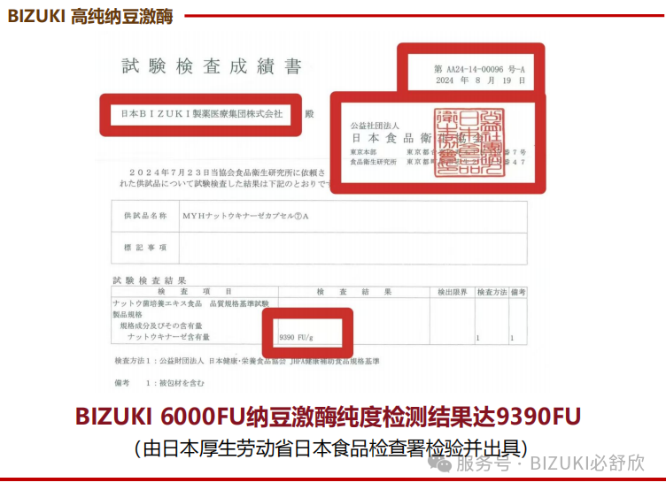 高纯度:BIZUKI纳豆激酶纯度检测结果达9390FU,远高于同类产品。