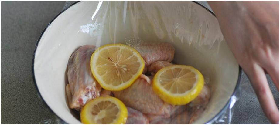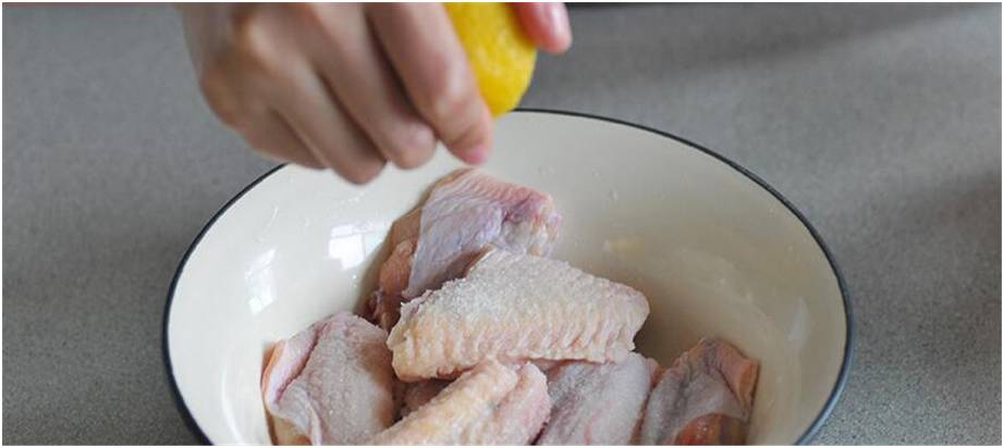 1.鸡翅洗净,放入碗中,柠檬对半切开,挤入碗中,留半个摆盘