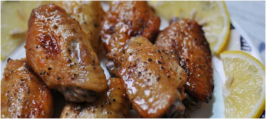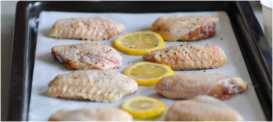 3.将鸡翅摆到烤盘中,将腌制过的柠檬片放在中间,在鸡翅上面撒上黑胡椒粒,手磨的黑胡椒更加好哦