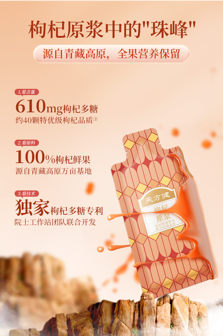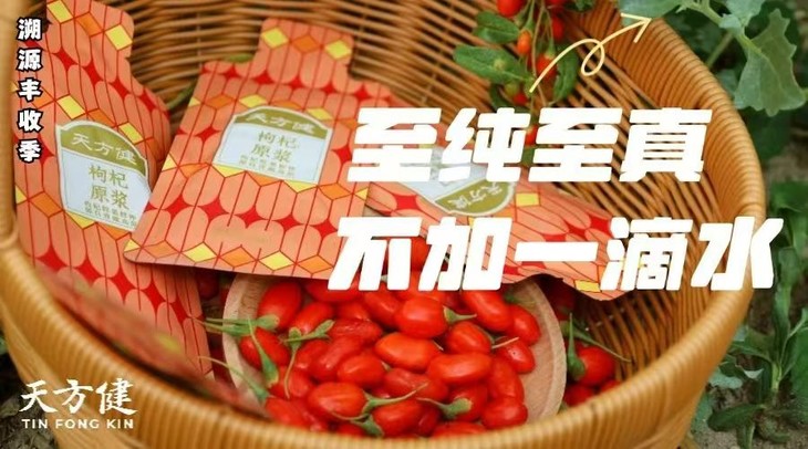 天方健的枸杞原浆,鲜果鲜榨,不加一滴水,且枸杞原料来自地处2800米高海拔,得天独厚的地理环境,现代科学的种植标准,使得枸杞更容易累积营养物质。
