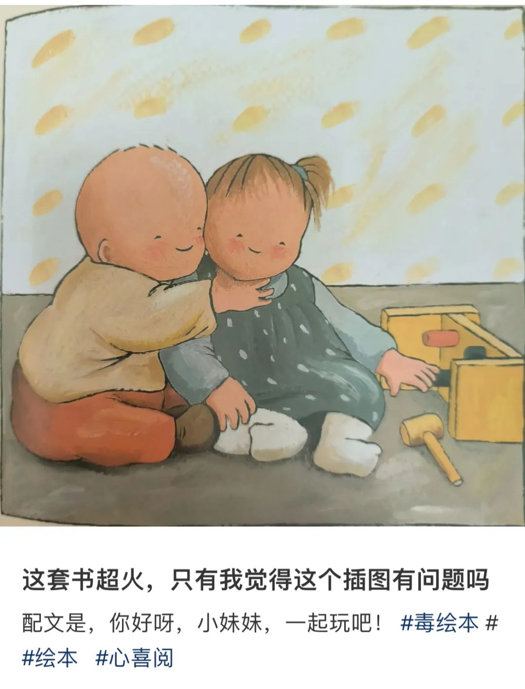 而被读者反应“毒绘本”的原因竟是这个插图中宝宝们拥抱的行为像是在“掐脖子”。
