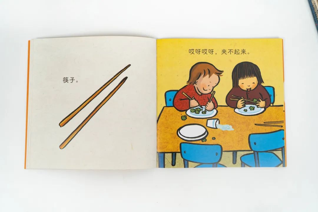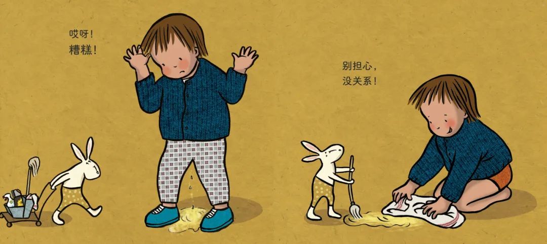这套绘本更为珍贵的一点是,它处处给我们传达了一种养育观念——要尊重儿童发展的规律。比如,刚开始学吃饭的宝宝可能会打翻饭菜,吃的到处都是——
