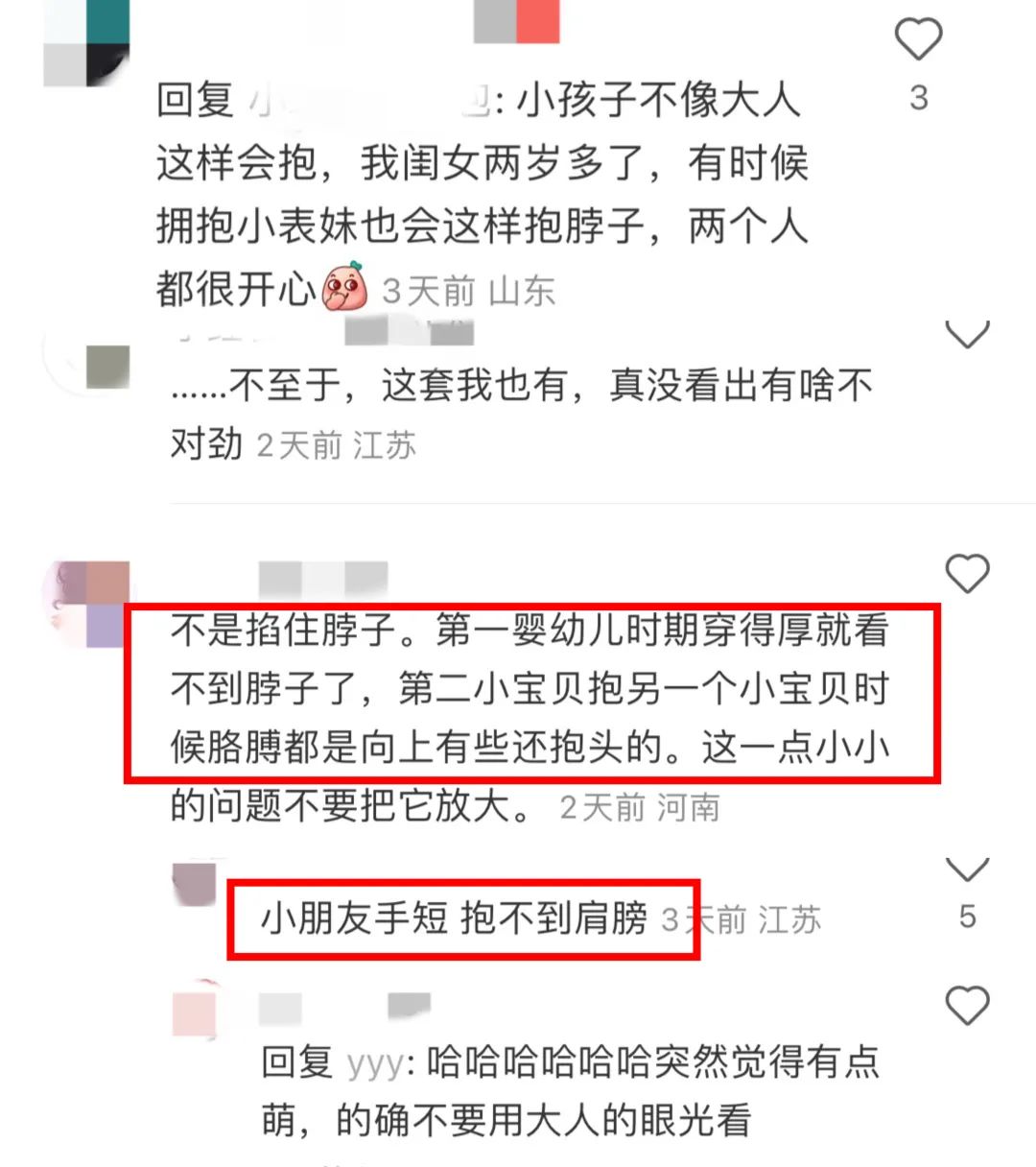 说这话的人可能真没注意过小宝宝怎么抱人——3岁之前的小宝宝头大大的、胳膊短短的,想要抱抱就只能环在脖子上。这更是小幼崽们萌化人的点,怎么就成了被攻击的原因了?