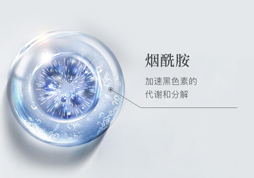2.烟酰胺——近年来超火的烟酰胺,它可以中途拦截向皮肤表层转移的黑se素,同时加速代谢芬解。