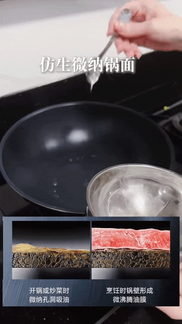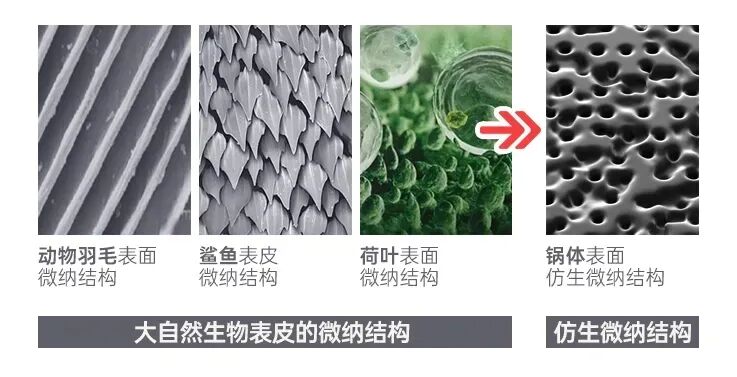 这是三禾研发团队历时7年,5万次炒菜实验研发,利用了大自然生物表皮不粘原理。