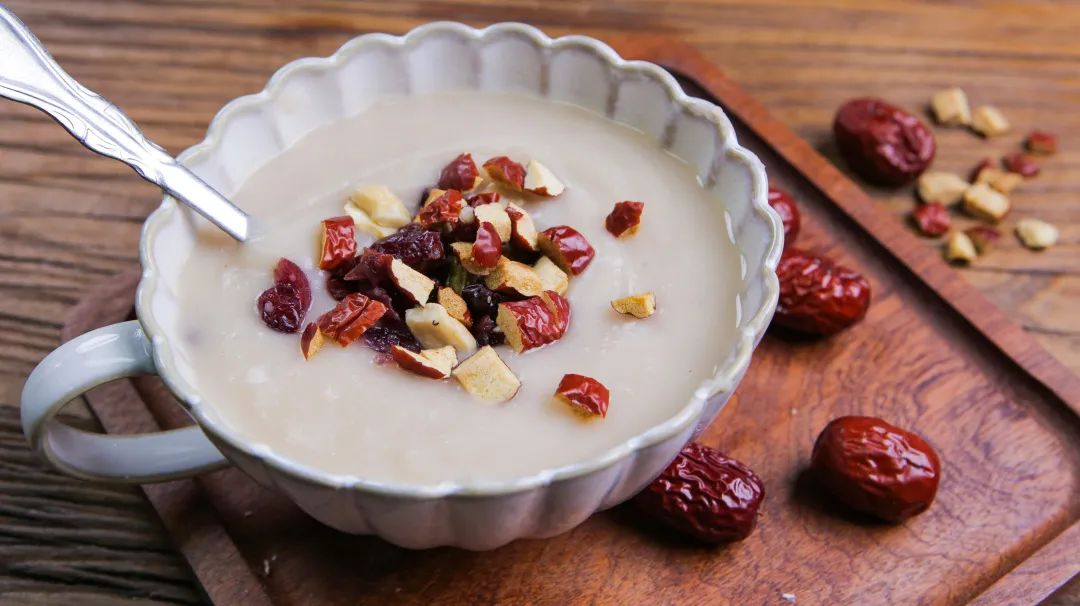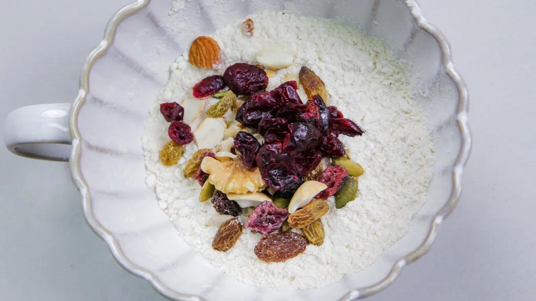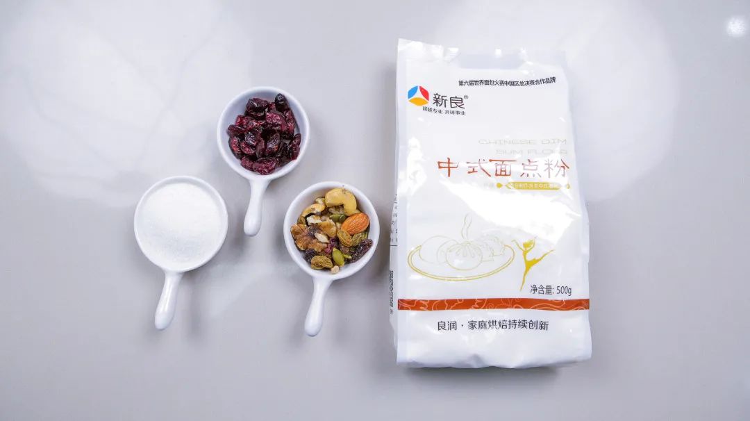 新良中式面点粉60g,红枣3颗,蔓越莓5颗,坚果适量,白砂糖20g,开水(牛奶)260g