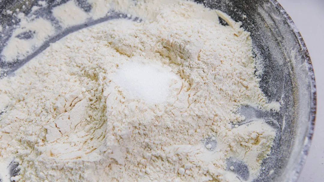 4/白砂糖倒入炒好的粉中搅拌均匀即可出锅,装入碗中,也可以等面粉凉了再加入白糖;