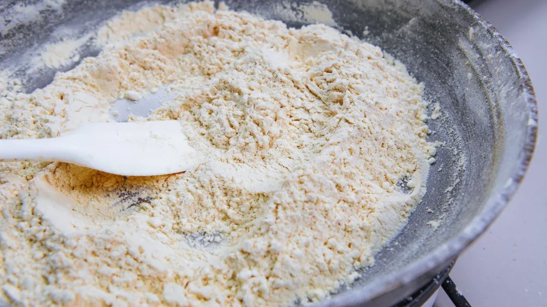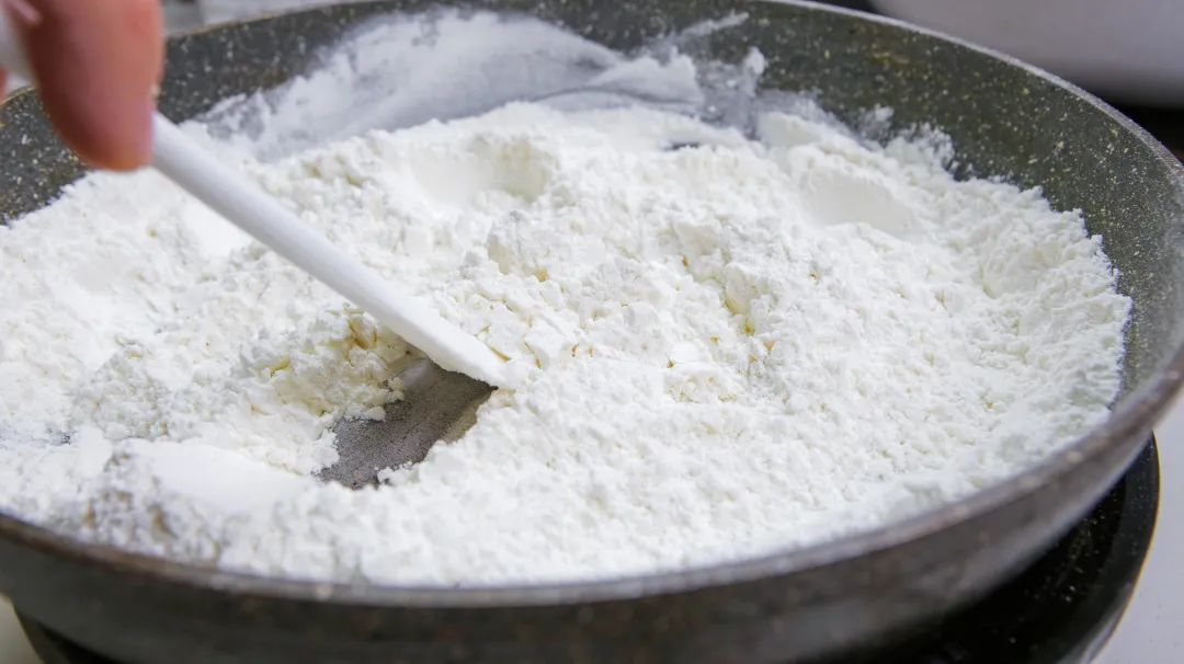 2/将面粉倒入平底锅中采用中火炒,中间不停地翻拌;