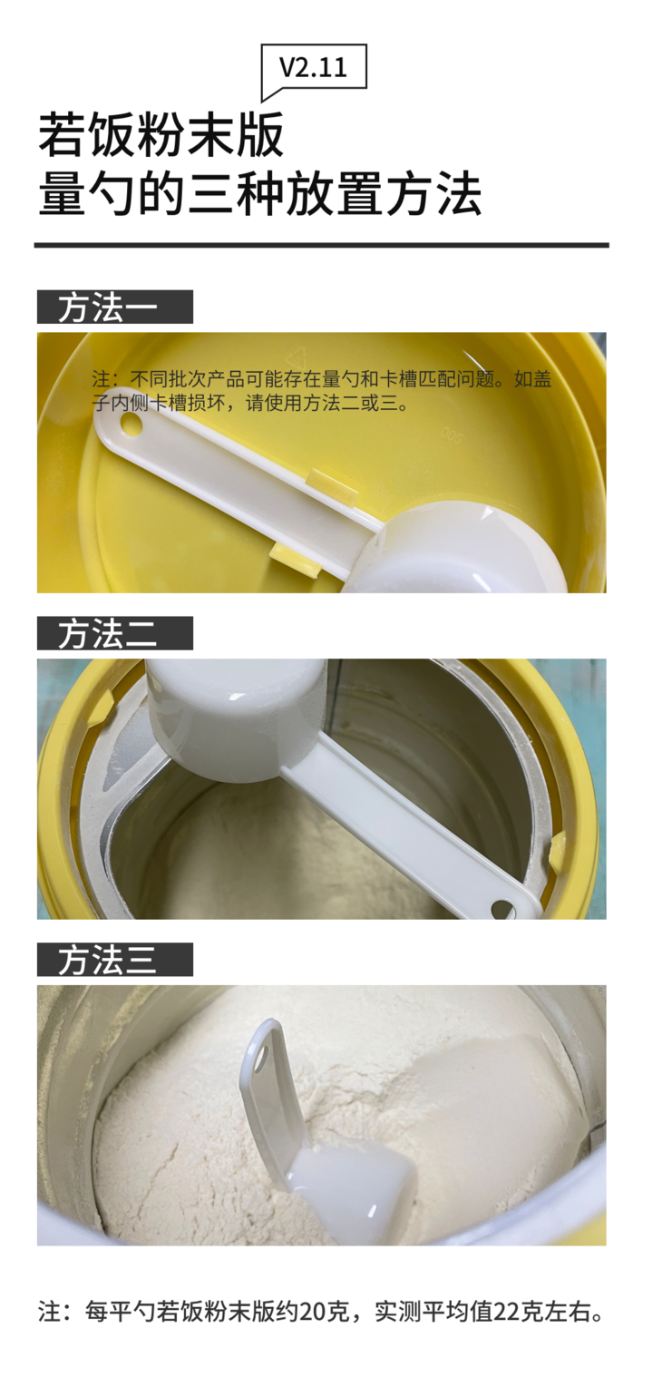 今天分享若饭粉末罐装V2.11量勺的三种放置方法,请看下图: