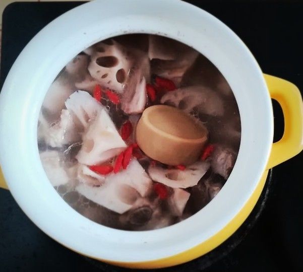 3、放入枸杞子,撒入盐,白胡椒粉(根据个人口味),再咕嘟5分钟,关火,这莲藕猪脊骨汤就煲好了;
