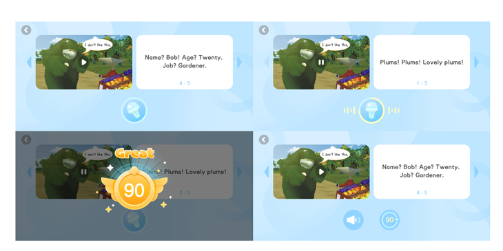 再次观看动画切片,完成简单动画配音,系统AI自动打分及时反馈,同时也能加强对句型表达的理解。