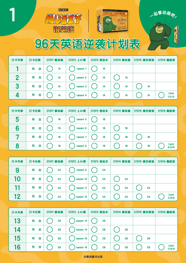 每天30分钟,打卡完成,4天解锁一集动画,24集动画的任务,只需要96天,大家也可以参考我拟的这张计划表: