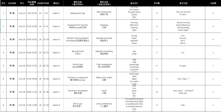 考虑到动画本身的知识点比较密集,我们的课程将每集动画拆解为4个核心语言目标,即1集动画对应4节线上课,共96课时。