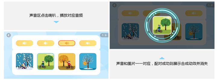 围绕看、听、说的能力进行多样化练习。例如下面展示的【声音图片连线题】,就可以训练在讲音义相结合。