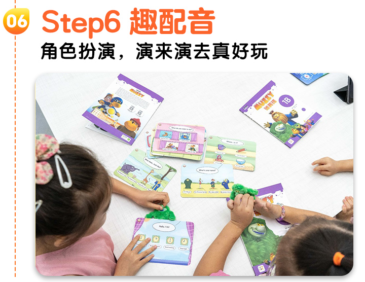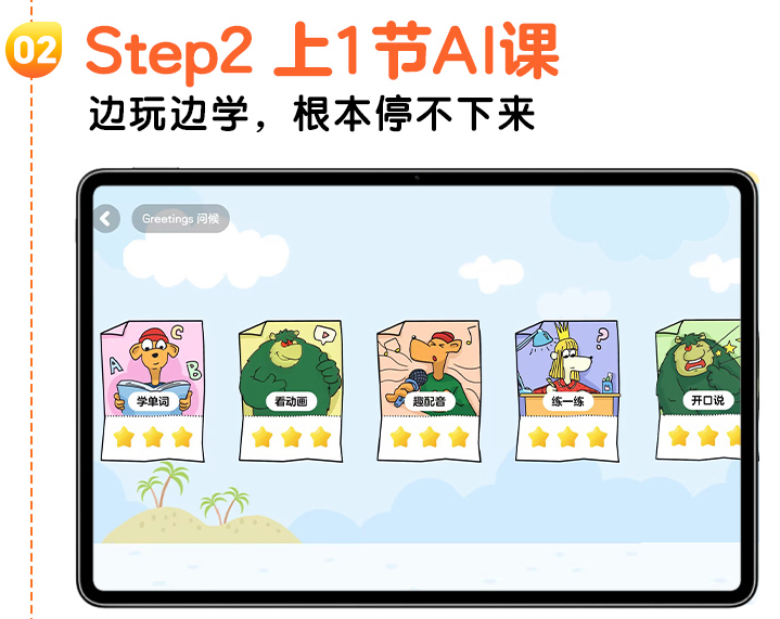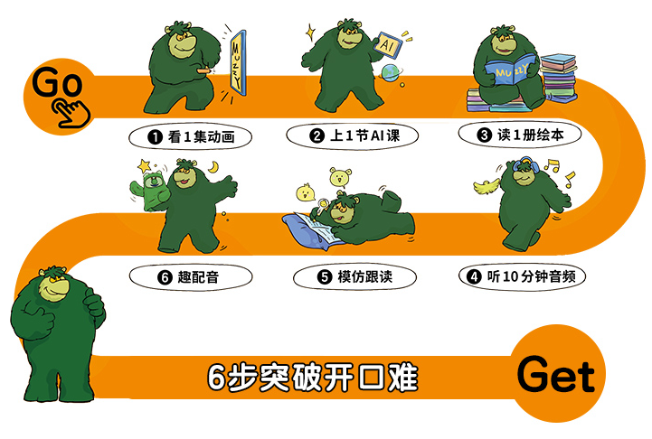 【看动画】-【上AI课】-【读绘本】-【听音频】-【模仿跟读】-【趣配音】