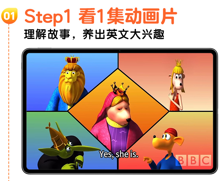 首先,让孩子看一集动画片,牢牢抓住孩子的兴趣。动画片的好处在于,即使听不太懂,看画面也能大概明白是怎么回事,孩子不会觉得没意思而放弃。