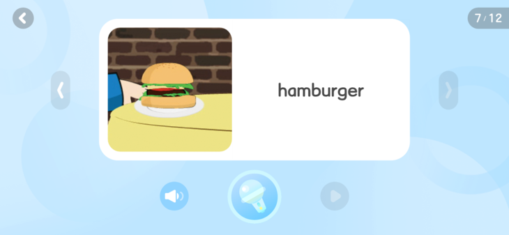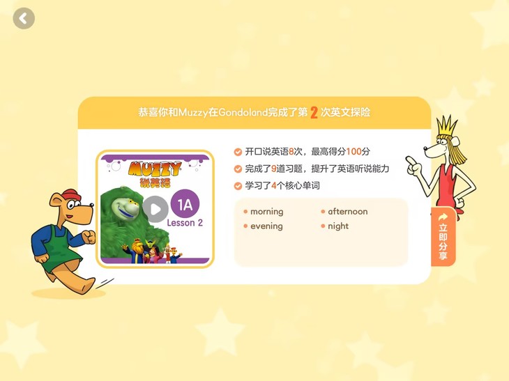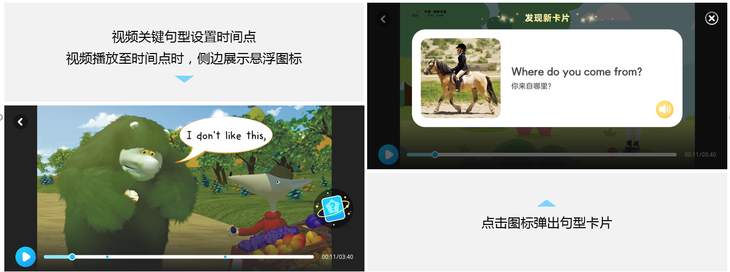 这里看的不是完整的一集动画,是观看动画切片,在1-2分钟的动画小场景中,密集感知英文表达;收集卡片的游戏形式,也可以让孩子边玩边巩固本节重点表达方式,让学习更有目标。