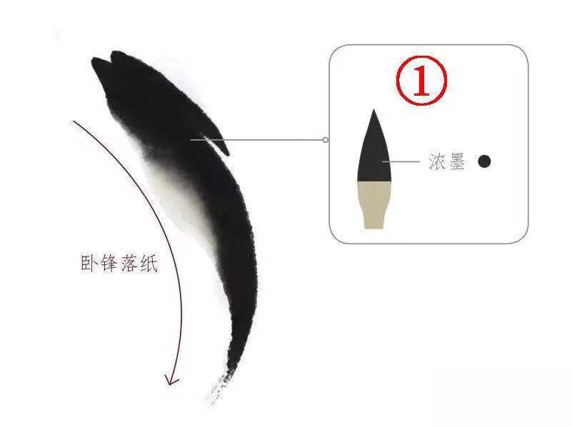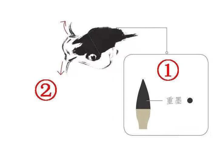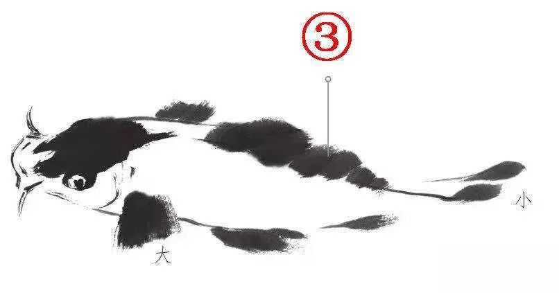 ①藏锋运笔画出鱼背,笔肚含较多水分。↓↓↓