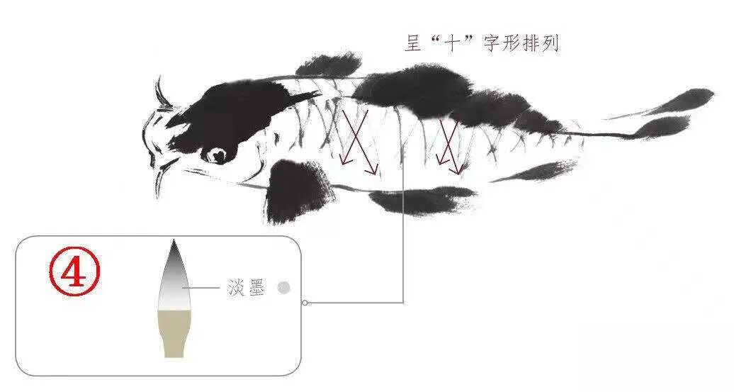 ④中锋点画眼珠,侧锋扫出腹鳍和臀鳍。↓↓↓