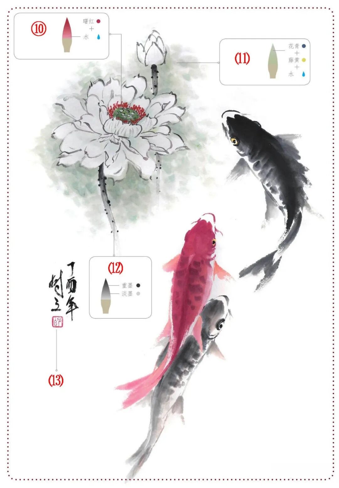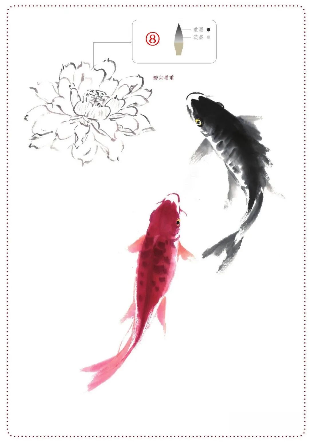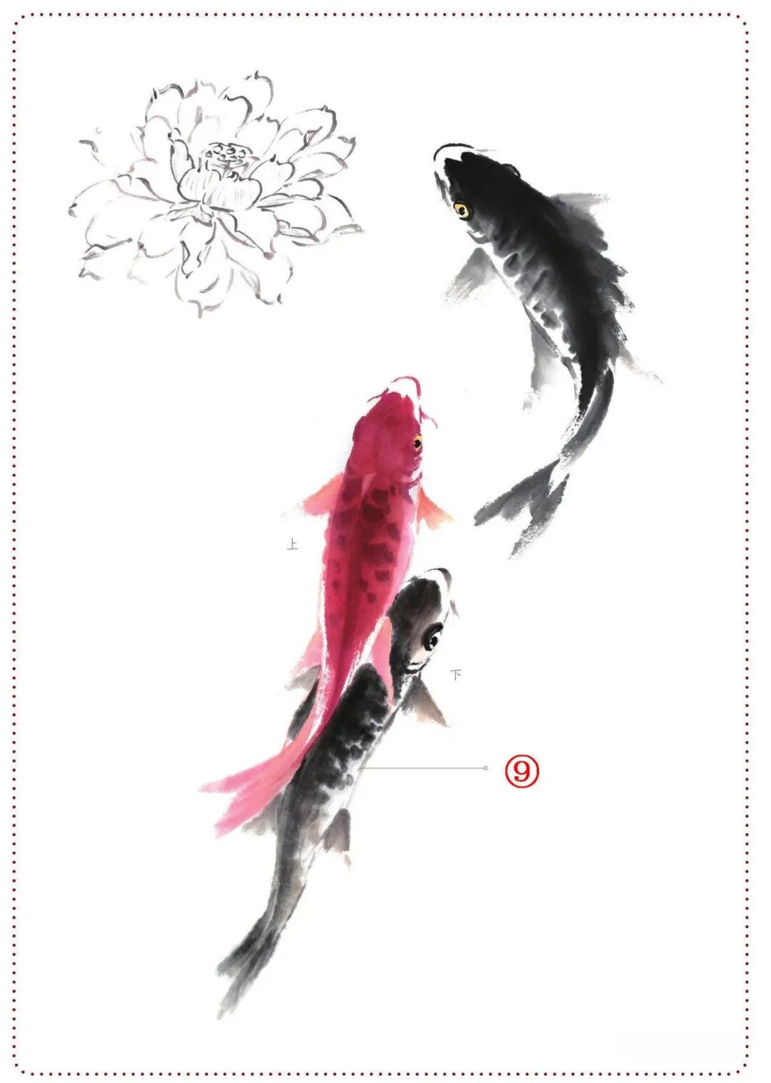 ⑨在红鲤鱼下方添画一条鲤鱼,墨色较淡,忌与其他鱼平行。↓↓↓