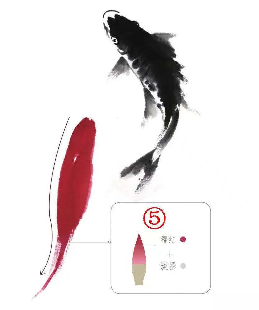 ⑤侧锋画出红鲤鱼背部,尾部留出飞白。↓↓↓