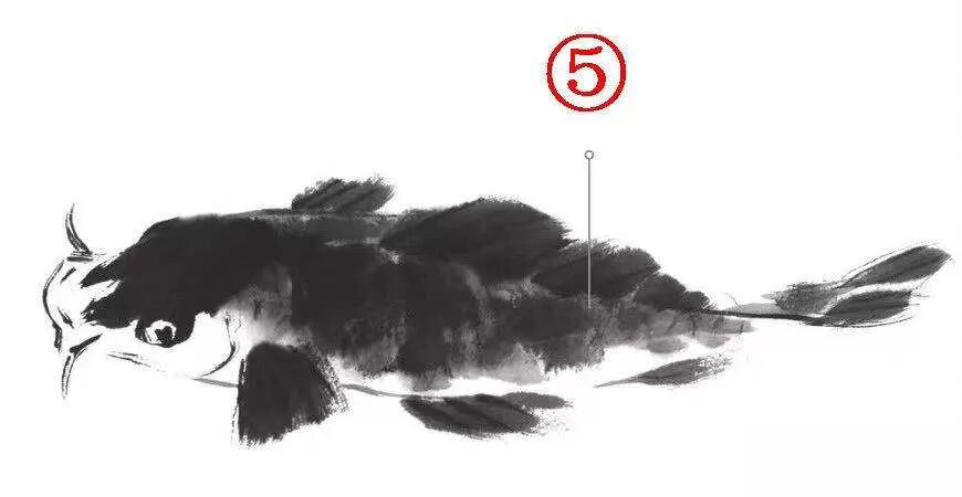 ⑤用淡墨大面积染画鱼身,表现暗部结构时,反复着色可达到效果。鱼腹下部分注意留白,以体现体积感。↓↓↓