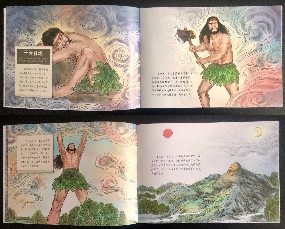 就拿「开天辟地」为例,如果单单给孩子讲“盘古劈开了天和地”,孩子脑子里很难有画面感,更加不明白“眼睛变成太阳和月亮、呼吸变成云和风,血液变成江河、脊椎变成山脉”到底是怎样的画面。